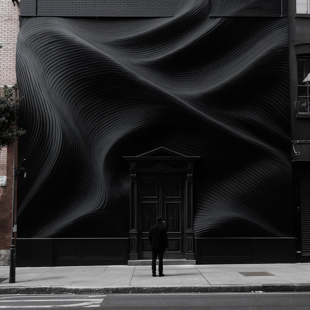Architectural photography of a commercial building featuring an undulating black facade, captured with a Canon EOS R5 using an RF 16-35mm f/2.8L USM lens. The settings include f/8.0, 1/250s, ISO 100, and a 24mm focal length. The composition is centered with a single silhouette for scale against the dramatic wave-pattern exterior, presented in monochromatic tones. The building includes a detailed wooden entrance, and the soft natural lighting highlights the gradients across the facade. Situated in an urban street setting with a clean sidewalk in the foreground, this image embodies a professional architectural photography style. The sharp details and geometric curves are emphasized, showcasing rich monochromatic gradation with hyperrealistic architectural details. The scene evokes a cinematic mood and urban contemporary style with subtle creative modifications for a distinctive visual impact.