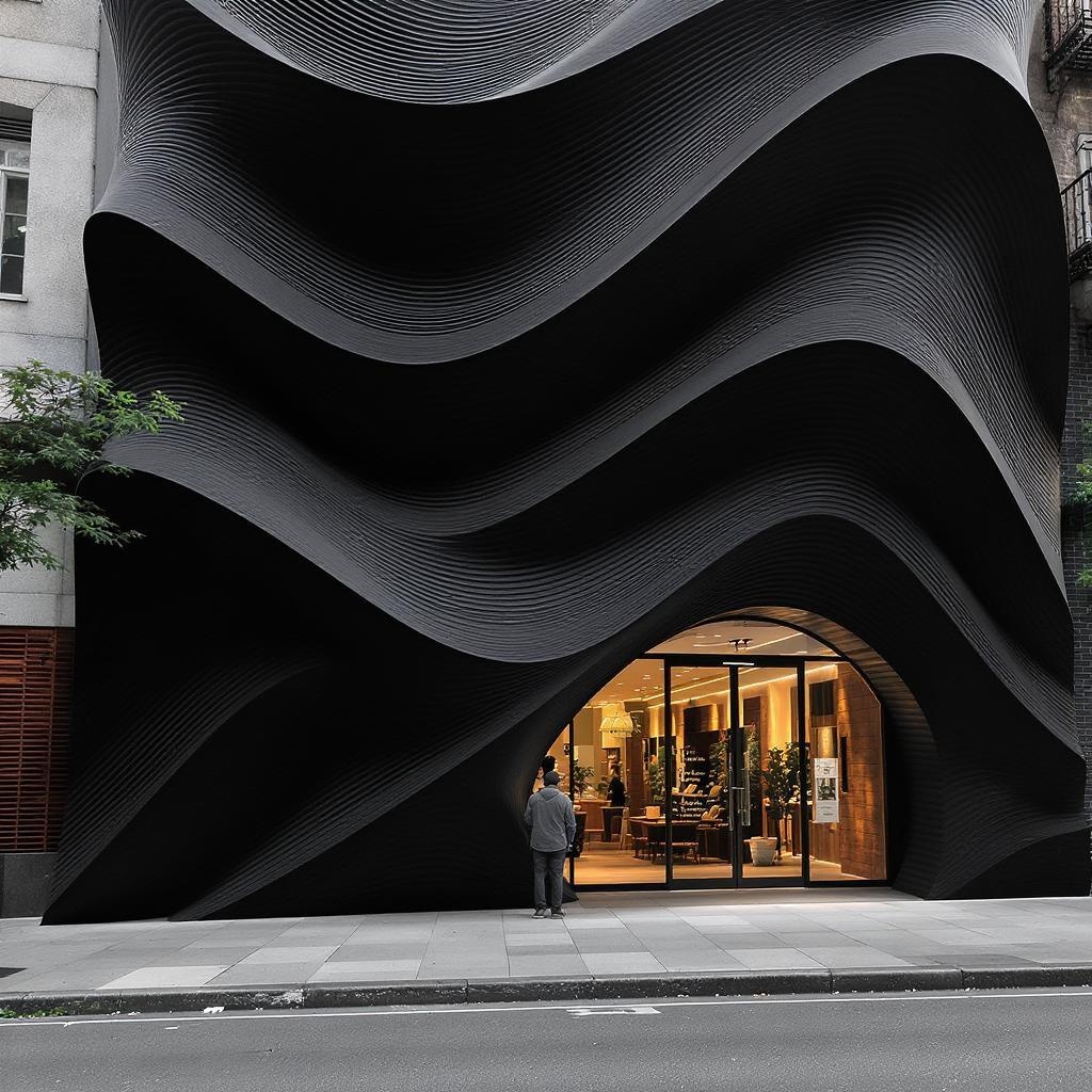 Architectural photography showcasing a commercial building with a dynamic undulating black facade, captured using a Canon EOS R5 with an RF 16-35mm f/2.8L USM lens, set at f/8.0, 1/250s, ISO 100, and a 24mm focal length. The composition is centered, incorporating a lone silhouette for scale against the building's exterior, which features dramatic wave patterns in monochromatic tones. The entrance is detailed with warm wooden accents, illuminated by soft natural light that highlights the facade's gentle gradients. The setting is an urban street with a pristine sidewalk in the foreground, embodying a professional architectural photography style. The image boasts sharp details, with geometric curves elegantly emphasized, offering a rich monochromatic gradation and hyperrealistic architectural elements. The mood is cinematic, reflecting an urban contemporary style with subtle artistic modifications that enhance the visual narrative.