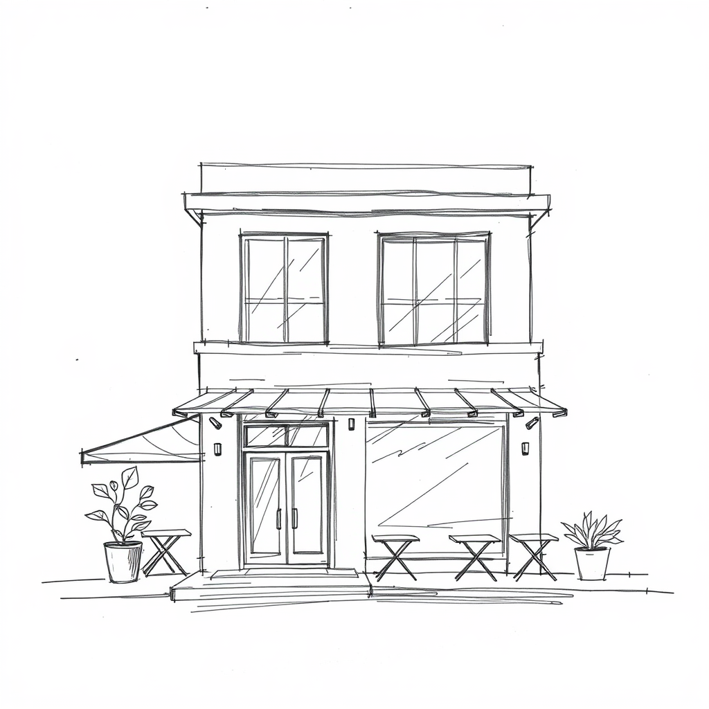Architectural sketch depicting a two-story contemporary cafe facade design, central composition, influenced by Bauhaus and modernist styles. Emphasize clean alignment lines and simplified forms, capturing a raw, expressive aesthetic. Set against a textured white canvas background, maintain the core elements while introducing subtle creative modifications for uniqueness.