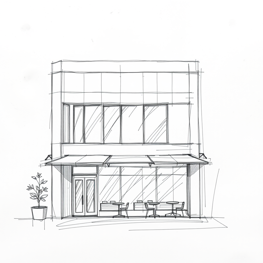 Architectural sketch featuring a central composition of a two-story contemporary cafe facade in Bauhaus style, embodying modernism with aligned lines and a simplified structure. Showcasing a stunning and expressive roughness against a white canvas texture background, the design should reflect personalized elements and creativity while maintaining the core aesthetics of elegance and innovation.