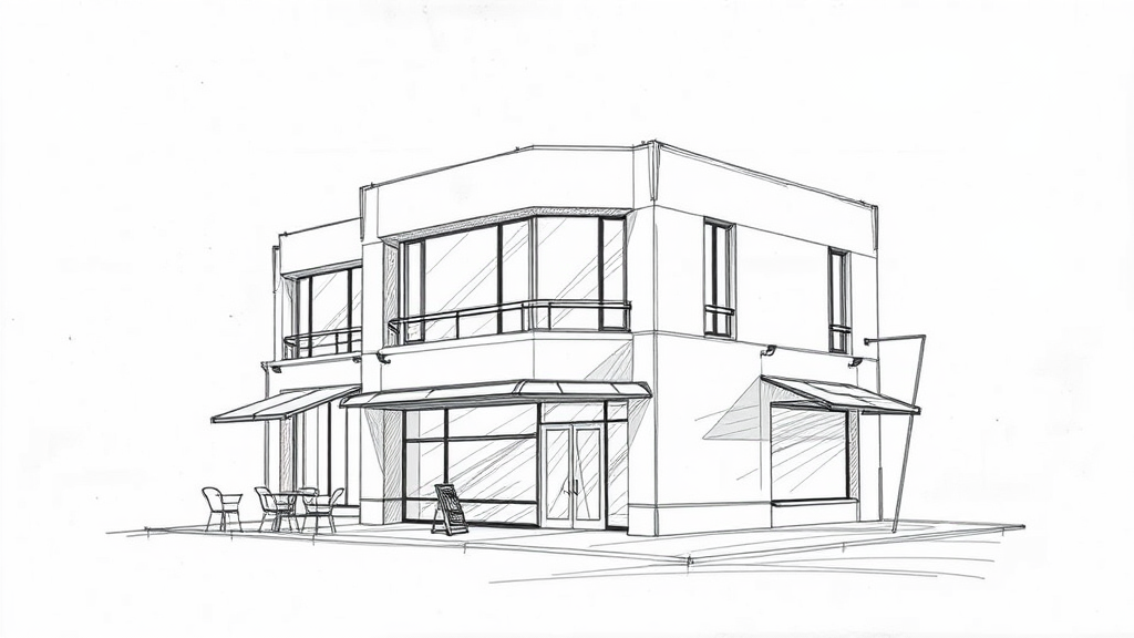 Architectural sketch featuring a striking central composition of a Bauhaus-inspired, two-story contemporary cafe facade design. Emphasizing modernism with clean alignment lines, the design offers a simplified yet gorgeous aesthetic expressed in a rough, dynamic manner. Set against a white canvas texture background, this piece captures the essence of raw architectural beauty.