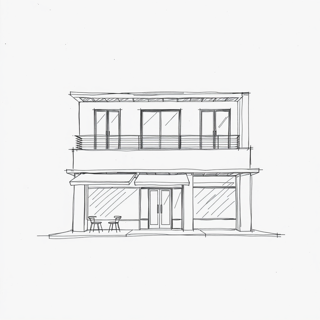 Architectural sketch of a two-story contemporary café facade, central composition in Bauhaus style with modernist influences, emphasizing alignment lines and simplicity. The design is expressed in a rough yet stunning manner on a white canvas texture backdrop, allowing for slight creative adaptations while maintaining the essence of the original concept.