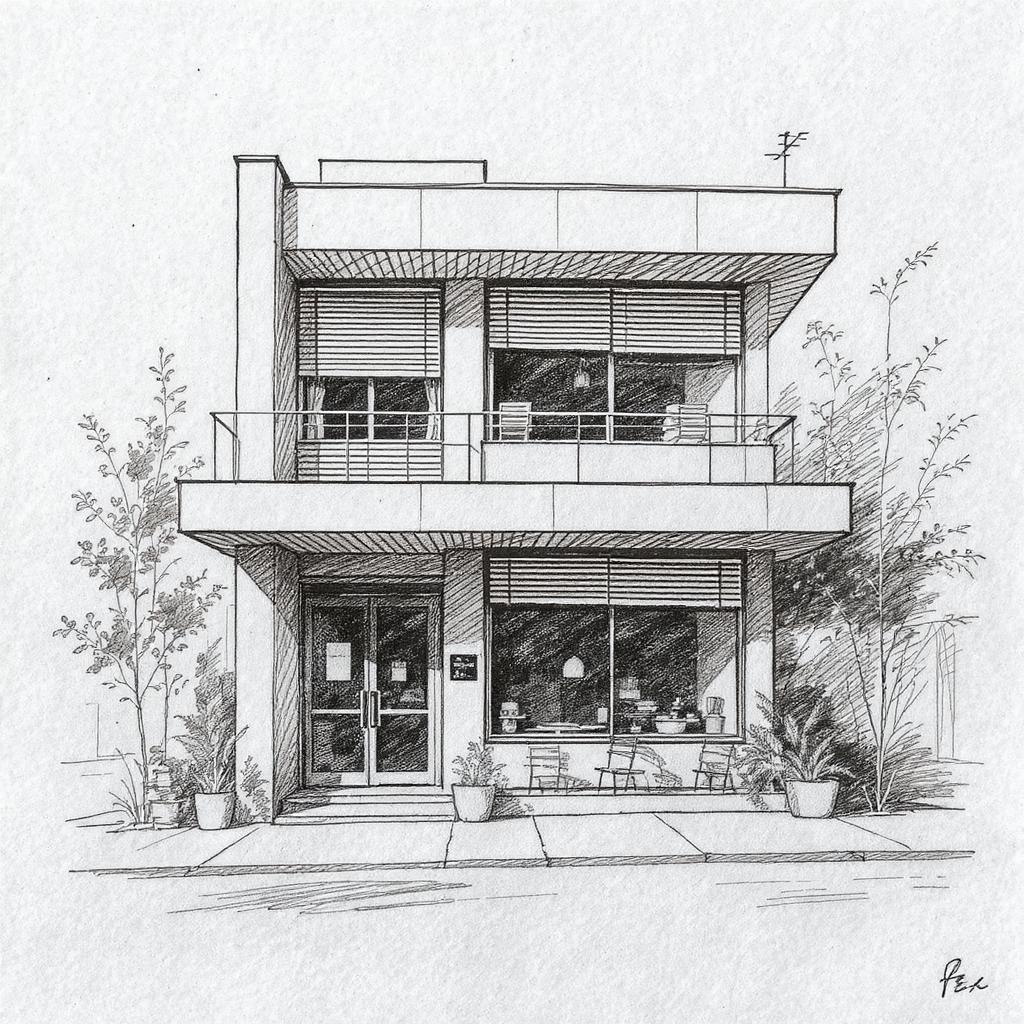 Architectural sketch of a two-story modern cafe facade, central composition in Bauhaus style, showcasing modernism with clean alignment lines, a beautifully simplified design, and a rough yet expressive approach. Set against a white canvas texture background, the facade is both striking and elegant, embodying a raw and unique aesthetic.