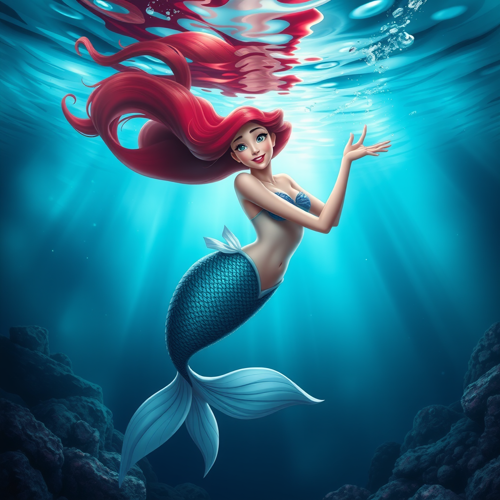 Ariel, inspired by Disney's Little Mermaid, becomes a stunning masterpiece in this high-quality, high-resolution artwork. Set against an enchanting under-the-sea background, the 17-year-old Ariel is depicted gracefully swimming. Her pose exudes elegance and charm, capturing the essence of the ocean's mystery. The artwork aims for visual clarity and refinement, achieving a 16k UHD experience with vivid HDR colors. Careful attention is paid to details, ensuring no distortions or inconsistencies in the depiction. The composition celebrates Ariel's youthful allure and spirit without any distractions like watermarks, logos, or other artifacts.
