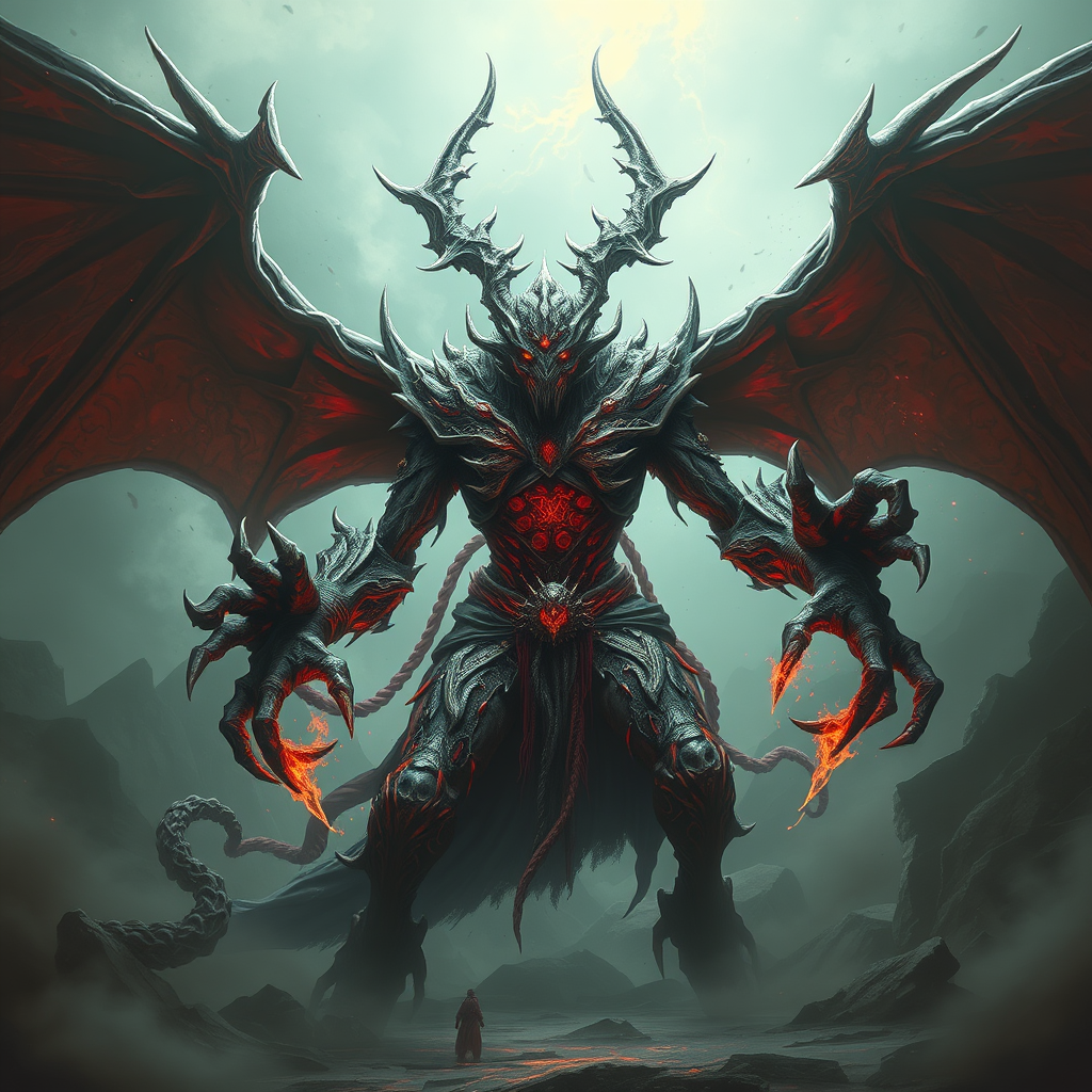 Arkthar the chaos necromancer, a harbinger of dread and disarray with an ominous presence as pervasive as the wind dispersing seeds of malevolence, rendered in a grandiose, hyper-realistic style evocative of a yugioh monster, highlighting intricate details and immense scale, with an air of mystery and power enveloping his form.