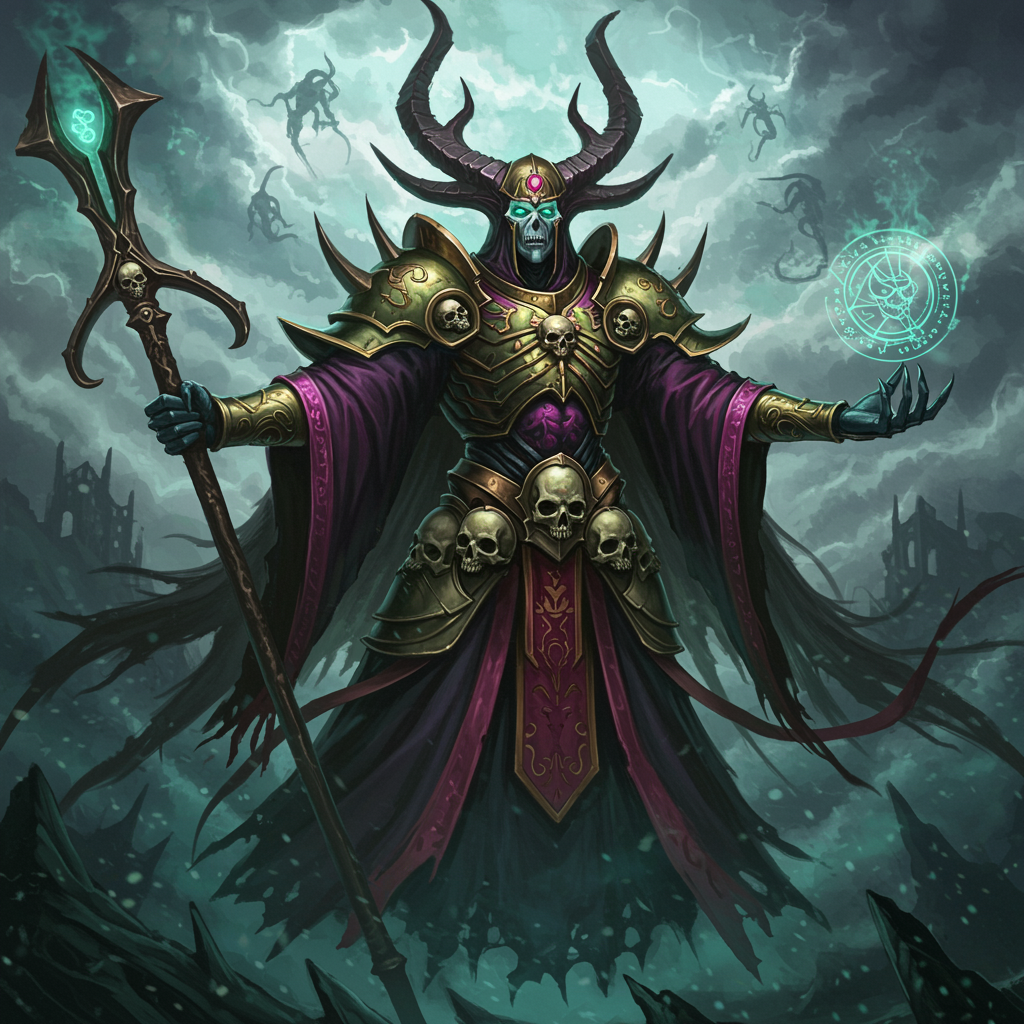 Arkthar the chaos necromancer, a harbinger of dread whose presence sows confusion and terror like seeds of malevolence scattered by a dark wind. This masterpiece captures Arkthar on a monumental scale, rendered with meticulous detail in a hyper-realistic style reminiscent of a yugioh monster. His form is both imposing and intricate, with eldritch energies swirling around him, casting an ominous glow that hints at untold powers. His eyes burn with malevolent intent, while his attire is adorned with arcane symbols and skeletal motifs, evoking an ancient, forbidden magic. The scene is set against a tumultuous sky, where the forces of chaos and necromancy entwine, creating an atmosphere of impending doom and unrivaled mystique.