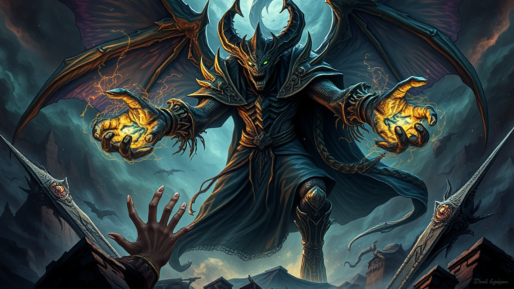 Arkthar the chaos necromancer, a harbinger of fear and discord, his presence as pervasive as the wind scattering seeds of malevolence, depicted on a colossal scale with intricate detail, hyper-realistic textures in the style of a Yu-Gi-Oh monster, emanating dark power and enigmatic energy, surrounded by an aura of swirling shadows and ethereal mist, eyes glowing with unholy light, hands crackling with necrotic energy, cloak billowing as if alive, set against a backdrop of a stormy, otherworldly landscape where chaos reigns supreme.