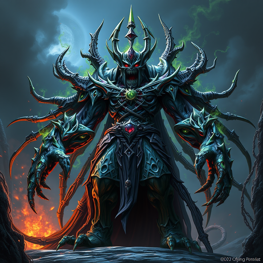 Arkthar, the chaos necromancer, a towering figure of malevolence, unleashes terror and bewilderment as effortlessly as the wind disperses seeds of darkness, crafted on a huge scale, in a style that emphasizes intricate details and hyper-realism, similar to a Yu-Gi-Oh monster, with sharp, defined features and an ominous presence.