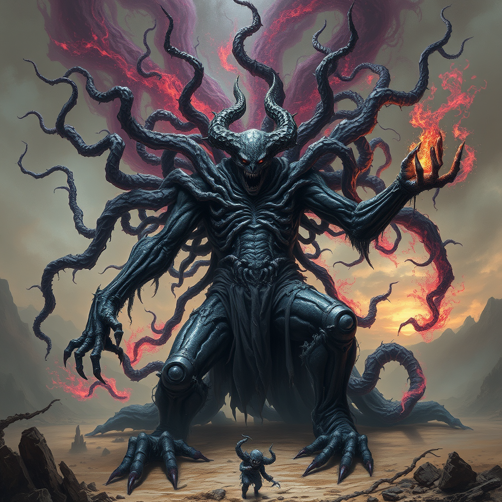 Arkthar the chaos necromancer, his twisted form sprawled across the desolate landscape like a grotesque work of macabre art, his black-rimmed eyes glowing with an otherworldly energy as he summons a maelstrom of dark, ethereal tendrils that writhe and twist like living serpents, each one infused with the essence of a thousand restless spirits, their mournful whispers carried on the wind like the sighs of the damned, as Arkthar revels in the chaos he has unleashed, his very presence a malevolent force that corrodes the fabric of reality, a gargantuan, nightmarish creature born from the darkest recesses of the human heart, a monster of unmitigated terror that seethes with an unquenchable hunger for destruction and mayhem, his power a cancer that spreads its dark influence far and wide, leaving ruin and despair in its wake, a gargantuan monstrosity with limbs as thick as trees and skin that shimmers like black water, eyes that burn with a malevolent green fire, and a voice that can shatter glass and curdle blood at a hundred paces, a colossal, monstrous being, driven by an insatiable hunger for darkness and chaos, an unending tide of terror that cannot be stopped, only unleashed and allowed to ravage the world, a monstrosity of unutterable horror, an avatar of unrelenting darkness, and Arkthar's will the sole driving force that shapes reality to his malevolent whim.