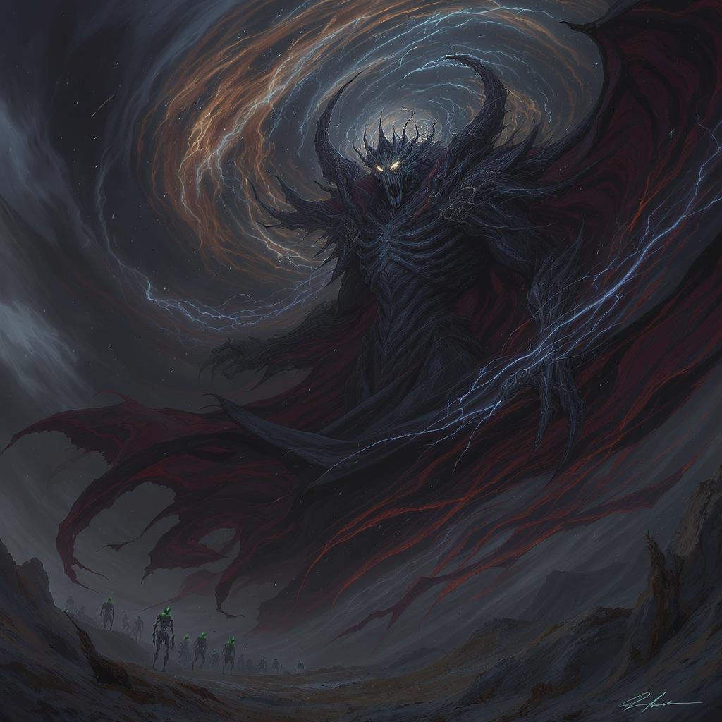 Arkthar, the chaos necromancer, looms large, an embodiment of fear and confusion, casting darkness like a storm spreading seeds of malevolence. He towers over the landscape in a hyper-realistic, detail-oriented style reminiscent of a Yu-Gi-Oh monster, capturing the essence of dread and awe on a monumental scale. His form is ethereal yet menacing, shrouded in mystical energy that swirls around him like a tempest. His eyes glow with an unearthly light, while skeletal minions emerge from the shadows at his command, adding depth and intensity to his terrifying presence. The scene is a masterpiece of intricate details and dynamic contrasts, drawing the viewer into a world where chaos reigns supreme.