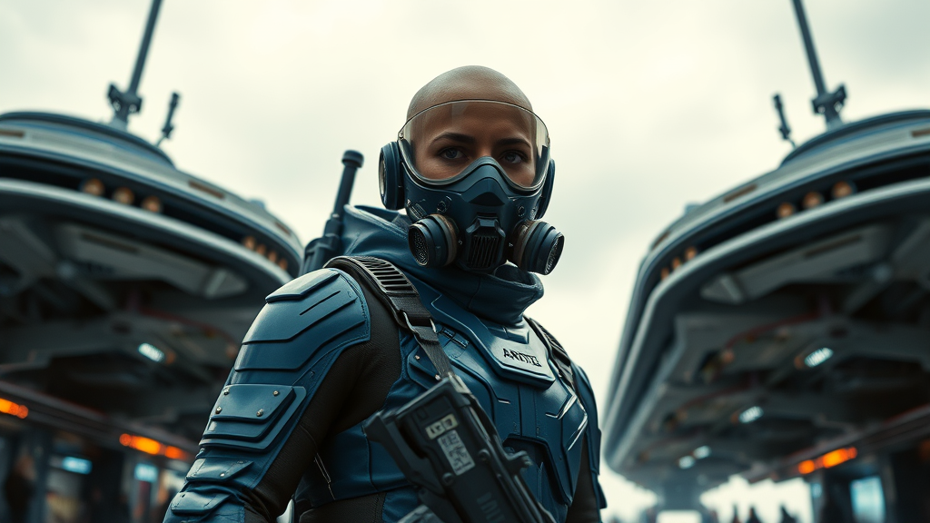 Armed female figure in a sleek blue sci-fi spacesuit stands confidently at a bustling spaceport. Surrounded by hovering sci-fi platforms, the scene is set under an overcast sky. Her futuristic mask and visor conceal a determined expression, while a sci-fi lens and respirator enhance the ensemble. The figure's bald head is prominent, accentuated by gleaming plate armor and segmented protective gear. Captured from a dynamic third-person view from below, the composition emphasizes intricate detailing, drawing inspiration from sci-fi movies. The setting is portrayed with a blend of photography and cinematic techniques, utilizing natural textures and lighting to achieve photorealism. A moody atmosphere is created through cinematic lighting and long exposure effects, with ray tracing bringing out the highest quality and detail. The 8K Ultra-HD resolution enhances the vividness of the scene, with natural and cinematic lighting adding to its dramatic impact.
