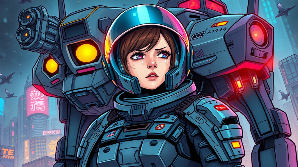 Armored astronaut heroine in full-length portrait, surrounded by a vividly detailed comic book style battlemech; exquisitely rendered fanart with a crying cyborg woman, characterized by full color and dynamic manga visual style; infused with the essence of anime key visuals and inspired by the imaginative worlds of valerian nartfixer and nfixer, with creative elements such as futuristic cities and neon aesthetics enhancing the scene.