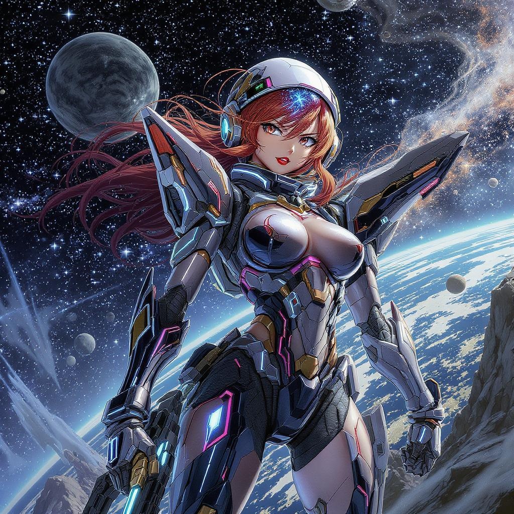 Armored astronaut heroine in full length portrait, comic-inspired battle mech, intricately detailed exquisite artwork, vibrant full color manga aesthetic, anime key visual essence, featuring a futuristic space explorer, dynamic and captivating.
