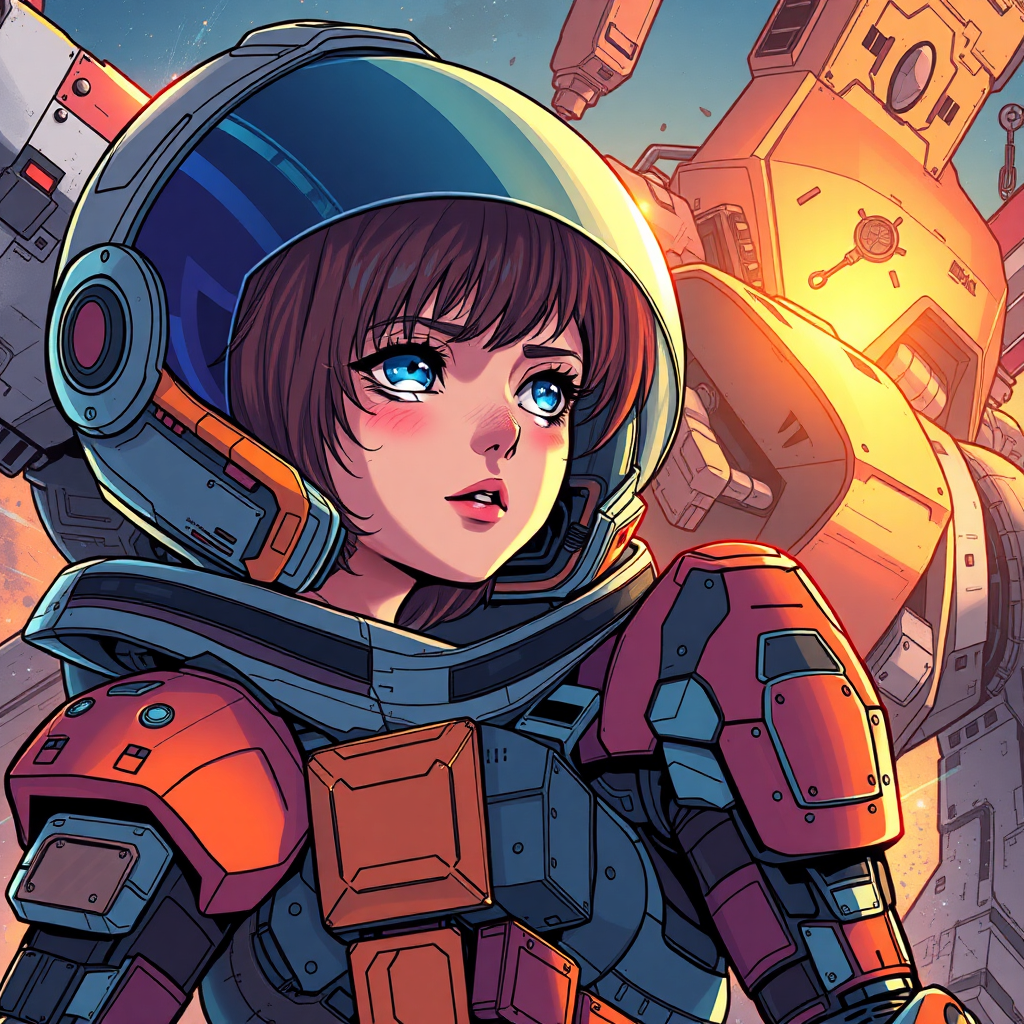 Armored astronaut heroine in full-length portrait, rendered in vibrant comic book style alongside a towering battlemech; exquisitely detailed fanart capturing a teary-eyed cyborg woman. The imagery bursts with rich colors and dynamic elements, inspired by the lush, visual aesthetics of manga and anime, reminiscent of a vivid key visual. A touch of Valerian universe echoes through, blending technology with intense emotion, encapsulating the nfixer essence.