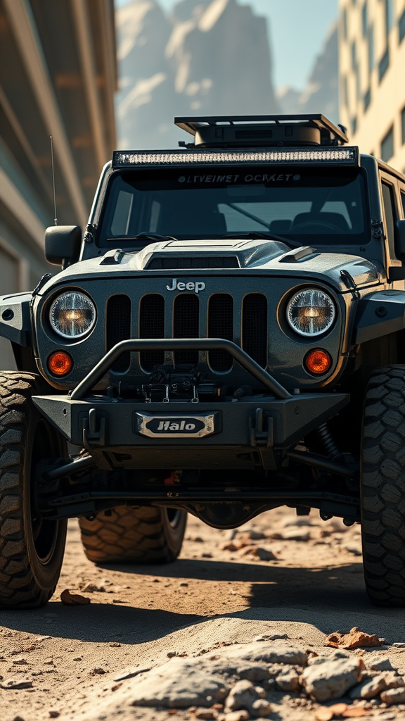 Armored sci-fi Jeep infused with the style of Halo and an alternate car design, inspired by car concept artistry and the intricate work of Sid Mead and Alex Ross, featuring highly detailed concept art with matte painting elements. The vehicle showcases elaborate detailing focused on a clean render aesthetic, following the rule of thirds for composition. Dynamic lighting highlights the contours and facets of the Jeep's design, creating a cinematic feel. The Jeep is centrally positioned in the scene, with a clean, denoised appearance, blending futuristic elements with rugged, off-road capabilities.