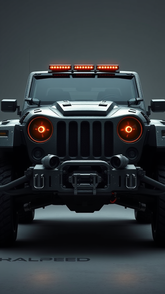 Armored sci-fi Jeep reminiscent of Halo with a futuristic twist, sleek and robust car concept influenced by Sid Mead and Alex Ross, featuring intricate details and dynamic design elements. The vehicle displays a clean render showcasing a center-focused composition, utilizing the rule of thirds for a balanced yet dramatic aesthetic. The matte painting style provides a cinematic quality to the concept art, enhanced by dynamic lighting that highlights the vehicular contours. The detailed and denoised finish emphasizes refined craftsmanship, merging futuristic design with classic armored vehicle functionality.