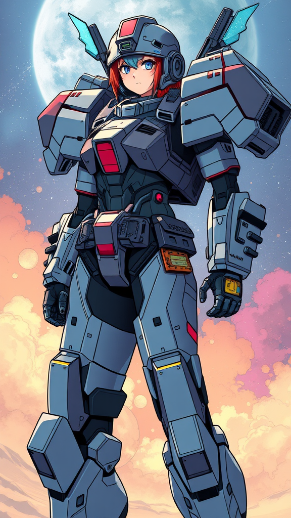 Armored space explorer heroine full-length portrait | comic book-inspired battle mech companion | intricately detailed, stunning fanart | vibrant manga aesthetic | anime showcase style | galactic adventurer Valeria Starfixer | starfixer.