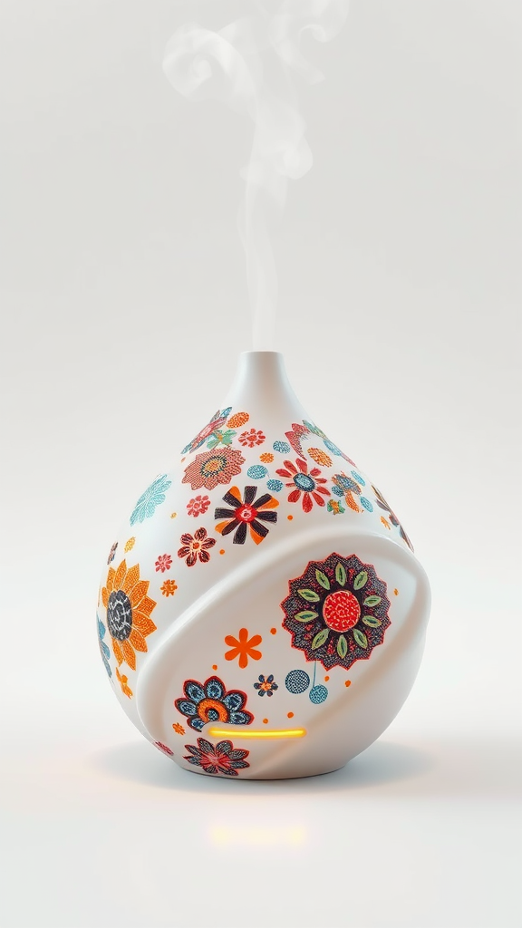 Aroma diffuser, drawing inspiration from the flowing forms and curves found in Gaudi's Barcelona architecture, featuring a smooth, rounded ceramic shell adorned with intricately hand-painted vibrant mosaics, detailed digital artwork in the style of ArtStation, hyper-realistic rendering on a clean white background, created using Unreal Engine, rendered in stunning 8K resolution with depth of field effect, maintaining a 1:1 aspect ratio, with subtle enhancements such as softly glowing LED accents that highlight the organic design and complement the intricate patterns.