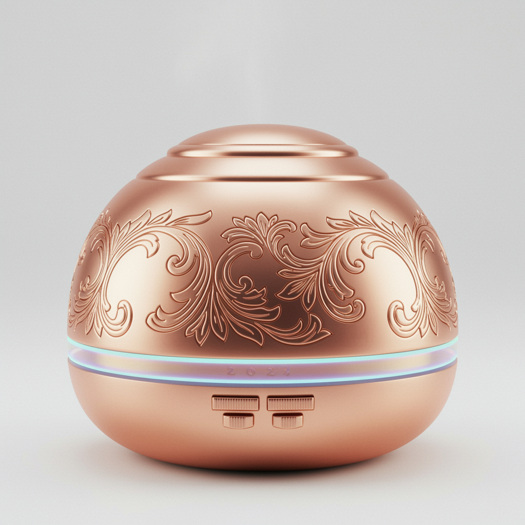 Aroma diffuser, evoking the luxury and elegance of the Palace of Versailles, featuring a lustrous rose gold metal exterior adorned with elaborate Baroque-style floral engravings, exquisitely detailed, in the style of artstation digital art, hyper detailed and hyper realistic, set against a pristine white background, rendered with Unreal Engine for lifelike textures, 8K resolution png, enhanced with depth of field, --ar 1:1, with a subtle iridescent glow for added sophistication.