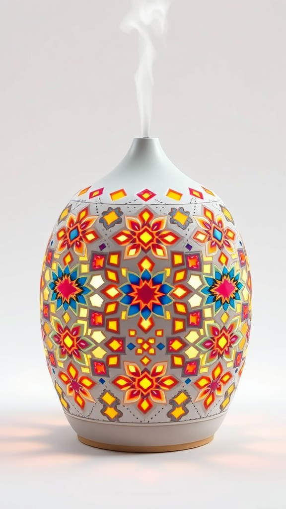 Aroma diffuser featuring vibrant geometric patterns influenced by Islamic art and architecture, crafted with a ceramic exterior adorned with delicate cutouts that let light illuminate intricate details, digital art, hyper-detailed and hyper-realistic design, set against a white background, utilizing unreal engine for lifelike rendering, captured in stunning 8K resolution with depth of field, aspect ratio 1:1, incorporating a touch of modern elegance with subtle metallic accents.