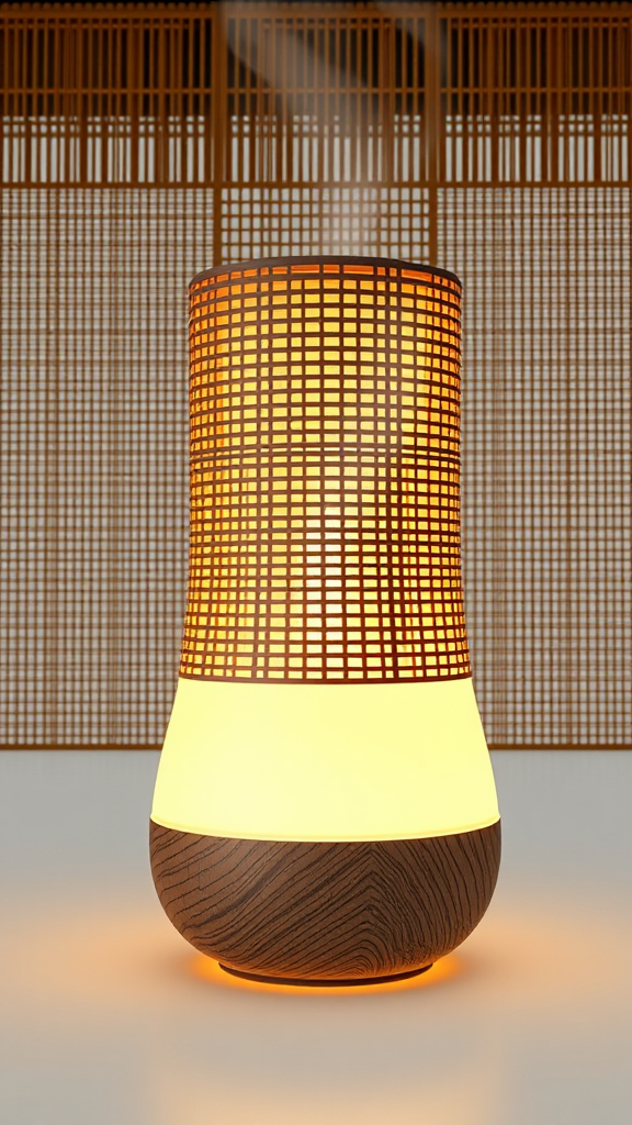 Aroma diffuser, influenced by the elegant, interwoven wooden slats of the Yusuhara Wooden Bridge Museum, featuring a sleek wooden exterior that mirrors this intricate design. Enhanced with gentle, ambient lighting to foster a warm and soothing atmosphere in any setting, crafted in the style of artstation digital art, hyper detailed and hyper realistic, displayed on a white background, utilizing unreal engine technology, in stunning png 8K quality, with a pronounced depth of field, designed in a 1:1 aspect ratio, subtly incorporating a touch of modern minimalism for a contemporary twist.