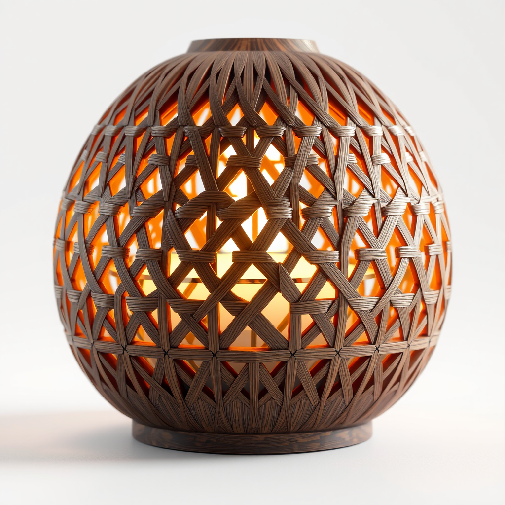 Aroma diffuser, influenced by the elegant, interwoven wooden slats of the Yusuhara Wooden Bridge Museum, featuring a meticulously crafted wooden exterior with a similar geometric pattern. Enhanced with gentle, ambient lighting for a soothing and cozy atmosphere in any environment. Exhibiting hyper-realistic and intricate design elements in the style of digital art from ArtStation, showcasing high detail and depth of field. Rendered in unreal engine with an 8K resolution, displayed against a pristine white background.