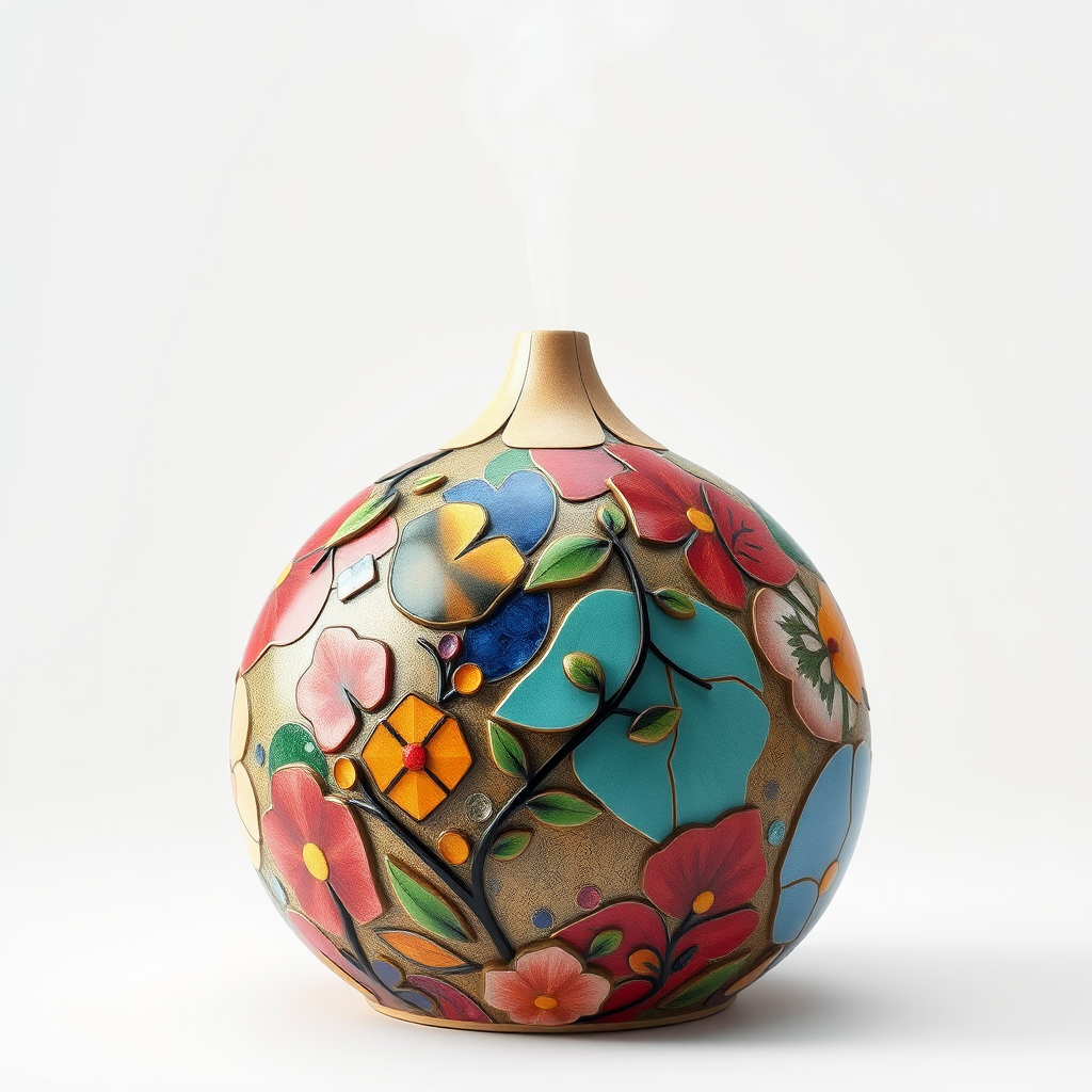 Aroma diffuser, influenced by the fluid lines and whimsical forms of Gaudi's Barcelona architecture, featuring a seamless ceramic exterior with hand-painted vivid mosaics, intricately detailed, in the style of artstation digital art, hyper realistic, against a white background, rendered in unreal engine, 8K resolution, with depth of field, aspect ratio 1:1, incorporating subtle hints of natural elements like vines and leaves intertwined with abstract patterns, evoking a sense of organic fluidity and vibrant creativity.