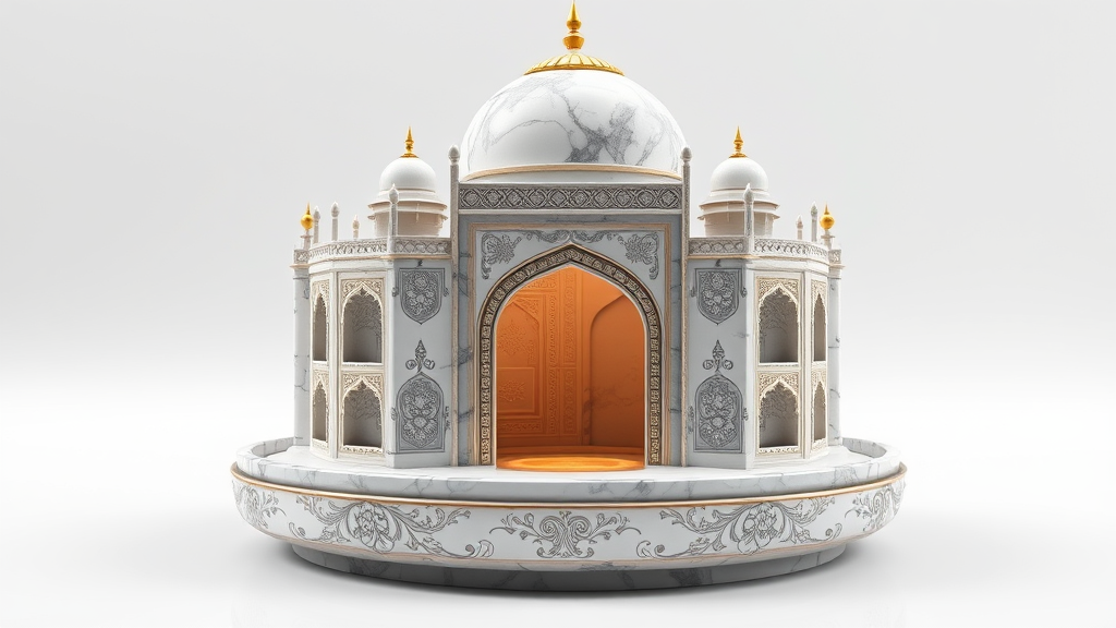 Aroma diffuser, influenced by the opulent and elaborate aesthetics of the Taj Mahal, featuring a polished marble exterior adorned with delicate floral engravings, ultra-detailed and hyper-realistic, styled like an ArtStation concept, set against a pristine white background, rendered with the power of Unreal Engine, presented in high-resolution 8K PNG, showcasing intricate depth of field, aspect ratio 1:1, with a subtle incorporation of gold accents for a modern twist, capturing the essence of luxurious design.