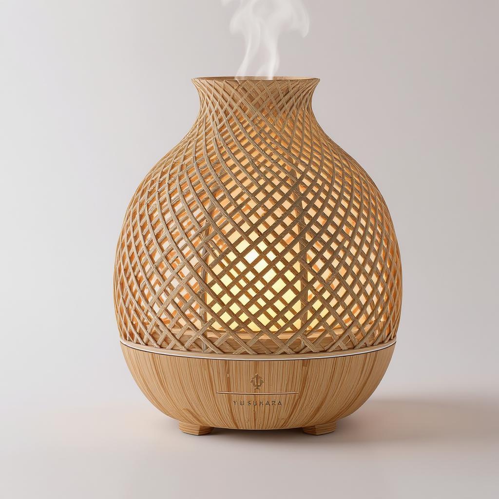 Aroma diffuser, inspired by the elegant, woven wooden structure of the Yusuhara Wooden Bridge Museum, featuring an intricately designed wooden exterior echoing the museum's interlocking architectural style. The diffuser is complemented by gentle, ambient lighting that enhances a cozy and soothing atmosphere, ideal for any setting. Created with a focus on hyper-detailed, hyper-realistic digital art, suitable for an artstation showcase, utilizing a white background and Unreal Engine for breathtaking depth of field, delivered in PNG 8K resolution, maintaining the essence of the original muse while infusing subtle creative enhancements.