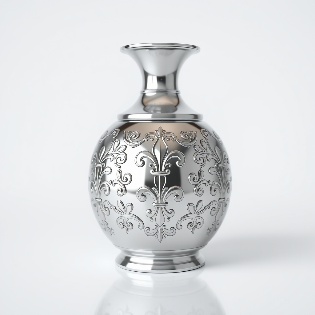 Aroma diffuser, inspired by the lavish elegance of the Palace of Versailles, featuring a lustrous silver metal exterior with delicate vine and fleur-de-lis engravings, hyper detailed, hyper realistic, set against a white background, rendered in digital art, artstation style, using unreal engine, png 8K, showcasing intricate craftsmanship with subtle reflections, enhanced depth of field, --ar 1:1.