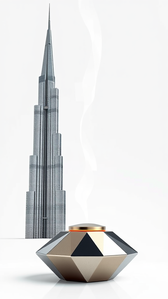 Aroma diffuser inspired by the sleek, modern geometric architecture of the Burj Khalifa in Dubai, featuring a metallic exterior with sharp, elegant lines; the design boasts luxurious, hyper-realistic details reminiscent of an artstation masterpiece, rendered with unreal engine for lifelike depth of field; the diffuser stands as a work of digital art on a pristine white background, with subtle creative elements enhancing its grandeur; resolution set to png 8K for exquisite detail, aspect ratio 1:1.