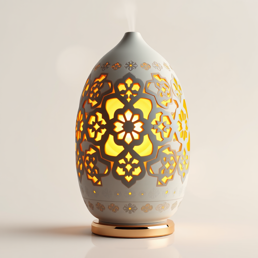 Aroma diffuser inspired by the vibrant geometric motifs of Islamic art and architecture, featuring a sleek ceramic exterior with intricately carved cutouts that cast mesmerizing light patterns, artistically styled for ArtStation, digital art showcasing hyper-detail and hyper-realism. Set against a pristine white background using Unreal Engine, presented in high-definition PNG 8K with a subtle depth of field, the piece retains its original essence while introducing innovative ornamental designs and an elegant gold-accented base, offering a modern twist to the traditional aesthetic ratio of 1:1.