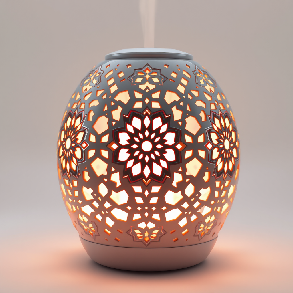 Aroma diffuser inspired by the vibrant geometric patterns of Islamic art and architecture, featuring a ceramic exterior with delicate, intricate cutouts that beautifully diffuse light; rendered in hyper-realistic, hyper-detailed digital art style, resembling an artstation masterpiece, with a white background, utilizing Unreal Engine for depth of field; rendered as a high-resolution 8K PNG, showcasing a symmetrical design with subtle metallic accents and soft, ambient LED illumination for an enchanting visual effect --ar 1:1.