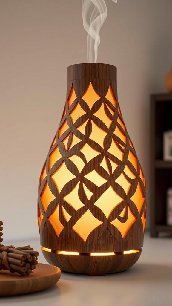 Aroma diffuser, intricately designed with interlocking wooden slats reminiscent of the Yusuhara Wooden Bridge Museum, featuring a beautifully crafted wooden exterior. The diffuser is complemented by soft, ambient lighting to enhance a cozy and relaxing atmosphere in any setting. Rendered in the style of ArtStation with hyper-realistic detail, digital art precision, and employing Unreal Engine quality, captured with depth of field on a pristine white background, in high-resolution 8K as a PNG file. Explore subtle creative variations while preserving the essence of the design. Aspect ratio 1:1.
