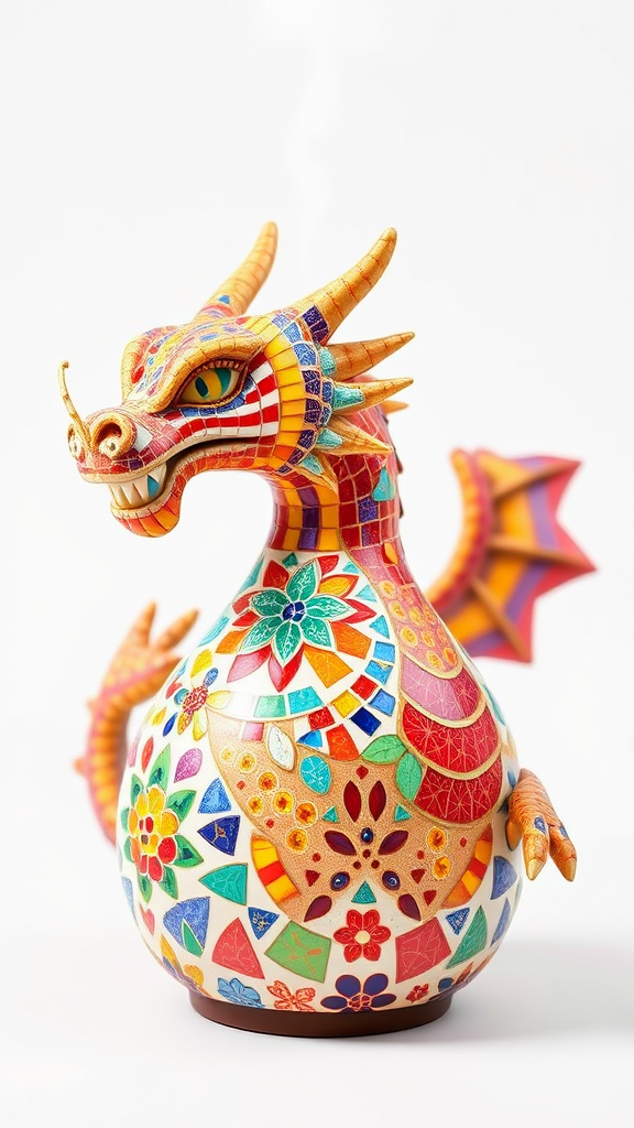 Aroma diffuser with a ceramic exterior, inspired by the whimsical, colorful designs of Antoni Gaudi's Park Guell, featuring a vibrant mosaic dragon design. The dragon's scales shimmer with kaleidoscopic tiles in radiant hues, capturing the essence of Gaudi's artistic flair. The digital art is hyper-detailed, with a focus on realistic texture, depth, and intricate patterns, akin to a creation in the style of artstation, rendered in unreal engine. The dragon's eyes glisten with lifelike realism, and its body flows in a dance of colors. The design is captured against a pure white background, highlighting every detail with precision. Image resolution is png 8K, with a depth of field that draws attention to the dragon's elaborate features, maintaining a 1:1 aspect ratio.