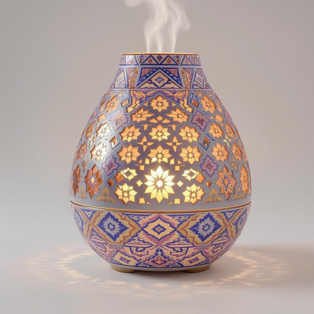 Aroma diffuser with a ceramic exterior inspired by vibrant geometric patterns found in Islamic art, featuring intricate cutouts that let soft light illuminate the designs, presented in the style of artstation, digital art, hyper detailed and hyper realistic, on a pure white background, rendered with unreal engine, in stunning 8K, gaining depth of field for added focus, aspect ratio 1:1, enhanced with a subtle golden hue embedded in the cutout edges, casting delicate patterns of light and shadow that enhance the serenity of the diffuser’s glow.