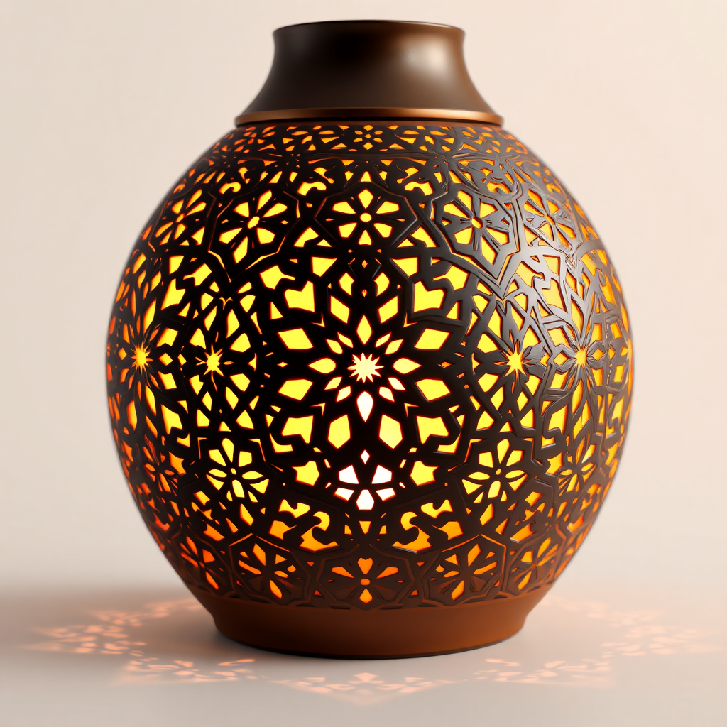 Aromatherapy diffuser, inspired by the vibrant geometric motifs of Islamic art and architecture, featuring a ceramic exterior adorned with intricate filigree patterns that cast enchanting light displays, digitally rendered in a hyper-detailed, hyper-realistic style reminiscent of artstation, set against a pristine white background, crafted with Unreal Engine intricacy, presented in stunning png 8K resolution with an exquisite depth of field, ratio 1:1.
