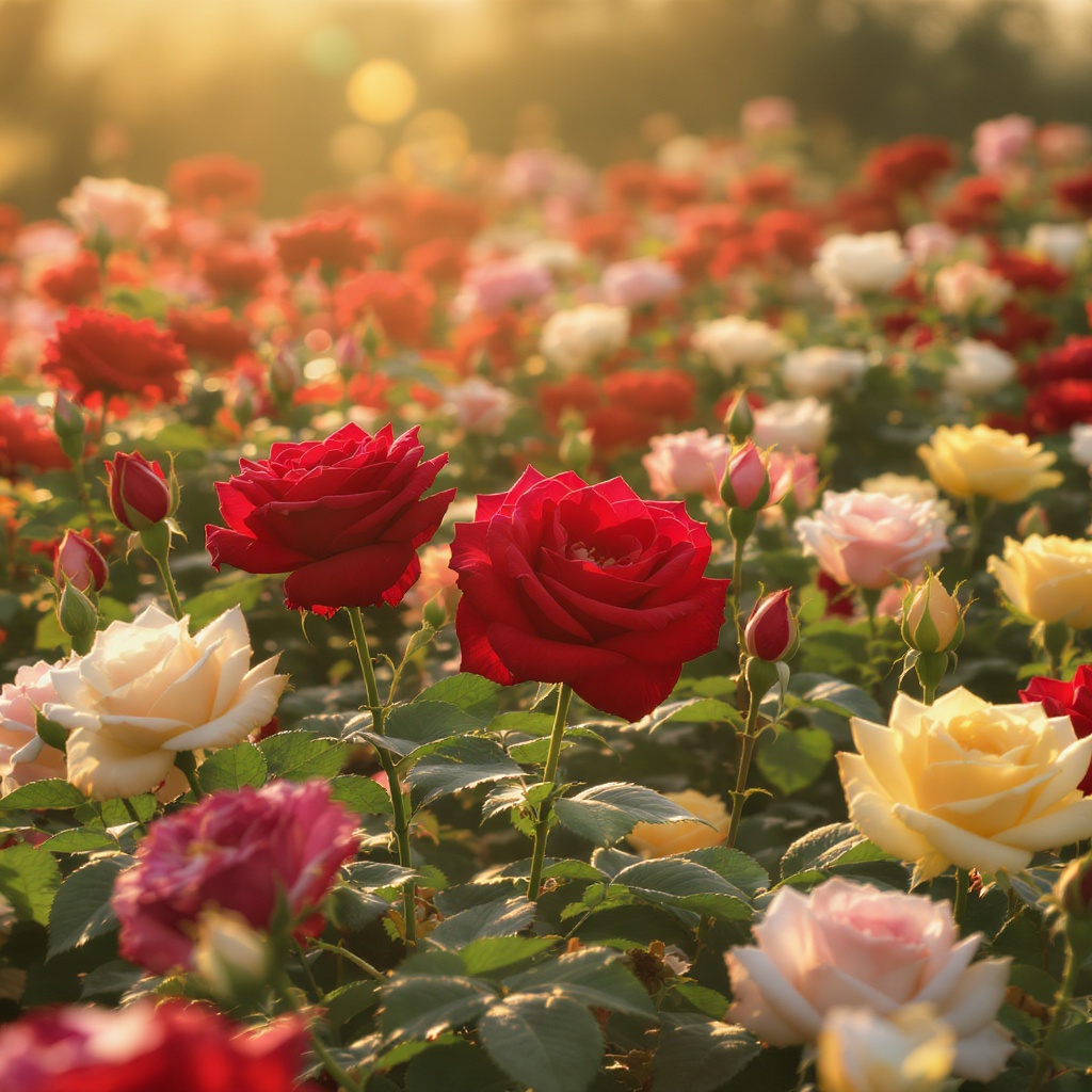 View this AI-generated image featuring a stunning array of roses in full bloom surrounded by tender rose buds in a vibrant flower garden showcasing vivid colors of red pink yellow and white captured in the soft golden glow of morning light with a dslr shot on 70mm the scene features intricate shadow
