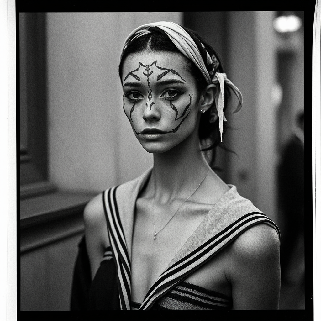 art by Paolo Roversi:16, photograph, stylized, ethereal slender supermodel, urban street wear, nautical theme, tribal headband, intricate face painting, melancholic expression, soft reflected light, cinematic film grain, Ilford HP5, F/1.8. Negative Prompt: unfocused eyes, duplicate heads, incorrect proportions, distorted features, unclear image, inaccurate anatomy, mismatched facial features, unnatural poses, undefined limbs, excessive body parts, distorted limbs, vibrant colors, overly sharp, misaligned features, detached limbs, overly thin, out of context, fragmented, low-resolution, overly cropped, too many fingers, excessive details, abstract features, visually noisy, undesired text elements, logos, uninspired edits.