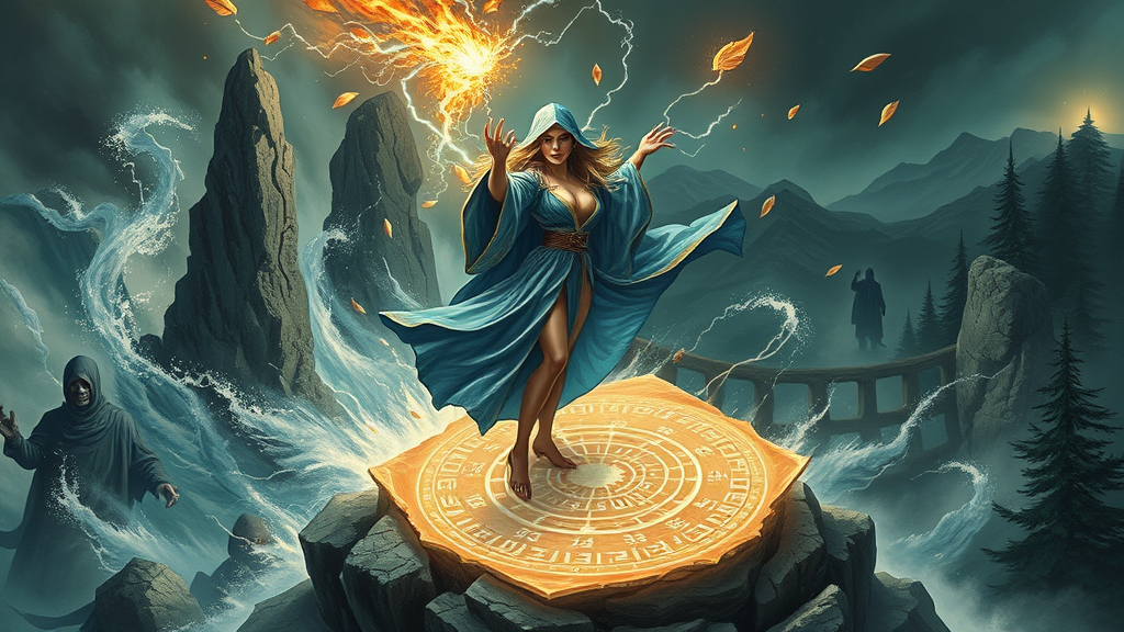 Art by Robert Maguire, Masterpiece, best quality, beautiful pinup model with shiny skin, soft lighting, standing on a windy mountain top dressed in a wizard robe. The scene is stormy with sharp focus on the fantasy wizard casting an impressive spell. Swirling water and electricity sparks envelop her, while pillars of rock emerge from the earth. Powerful winds carry leaves around her, and a glowing magical circle with intricate runes forms beneath her feet. Shadowy figures lurk in a dark forest in the background, adding an air of mystery and danger. The dynamic interplay of swirling elements, bright magical energies, and an eerie atmosphere creates a captivating visual of magic and might.