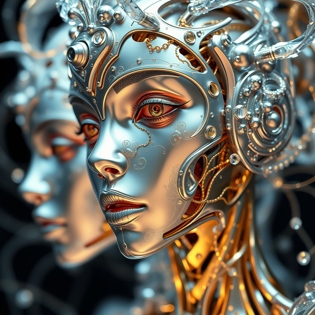 art from the 'mastery of manipulation' series by Jasper Harvey, in the essence of futuristic optics, adorned in shimmering silver and lustrous gold, featuring intricately detailed facial features amidst swirling vortexes, realized in stunning 8k 3d, whimsical cyborgs crafted from ethereal crystals, capturing a sense of elegance and mystique.