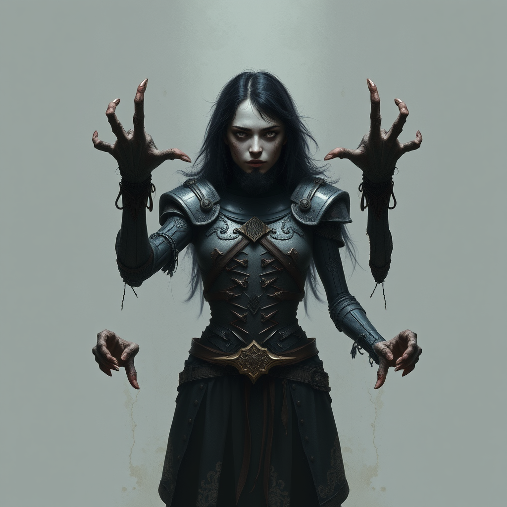 Art inspired by Greg Rutkowski, featuring digital art with a gray palette, showcasing a proud pose. It embodies an ultra-quality, dark fantasy ambiance set in a medieval context. The composition emphasizes symmetry with an intentional low-resolution feel, textural elements, and an error aesthetic. It includes cropped sections and consciously integrates imperfections like low quality, JPEG artifacts, and duplicative elements. The work explores themes of morbid fascination with aspects such as mutilation, out-of-frame extensions, and anatomically unusual elements like extra or fused fingers, blurred limits, and disfigured proportions. It may have distorted facial features, such as a long neck or misplaced facial hair, like a beard on a woman with black hair. Other characteristics include intentional anatomical errors like missing or extra limbs and cloned facial expressions alongside inevitable markers like a username or signature element.