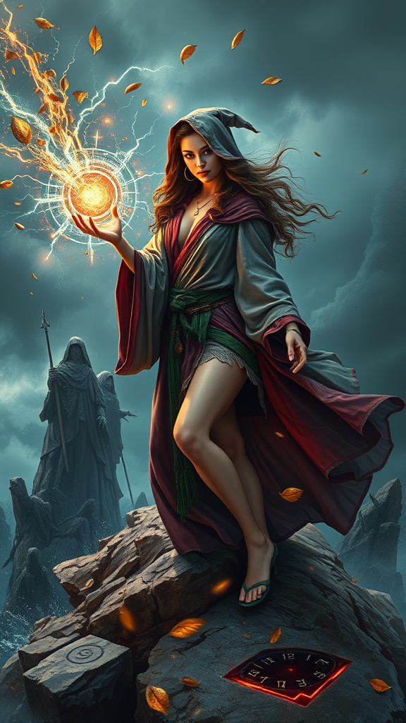 Art inspired by Robert Maguire, featuring a beautiful pinup model with shiny skin and soft lighting, adorned in a wizard robe atop a windy mountain with a stormy backdrop. The model, a fantasy wizard with sharp focus, casts a spell that swirls water around her, accompanied by vibrant sparks of electricity illuminating the scene. Pillars of rock emerge from the earth as strong winds dance with flying leaves. A glowing magical circle and powerful runes surround her, while shadowy figures loom in a dark forest in the background. The energy is intense, magical, and captivating, creating a mesmerizing blend of nature and fantasy elements.