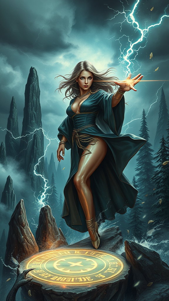 Art inspired by Robert Maguire, featuring a stunning pinup model with shiny skin and soft lighting, clad in a wizard robe. She stands on a windy mountaintop amidst a stormy sky. The image boasts a sharp focus on a fantasy wizard casting a spell. Swirling water and electricity sparks surround her, creating an electrifying atmosphere. Pillars of rock rise from the earth, and strong winds scatter leaves around her. A glowing magical circle with powerful runes illuminates the scene, while shadowy monsters lurk in the dark forest background. The artwork maintains a sense of realism, avoiding anatomical errors such as extra or missing limbs, mutations, or disconnections, ensuring a cohesive and visually appealing masterpiece.