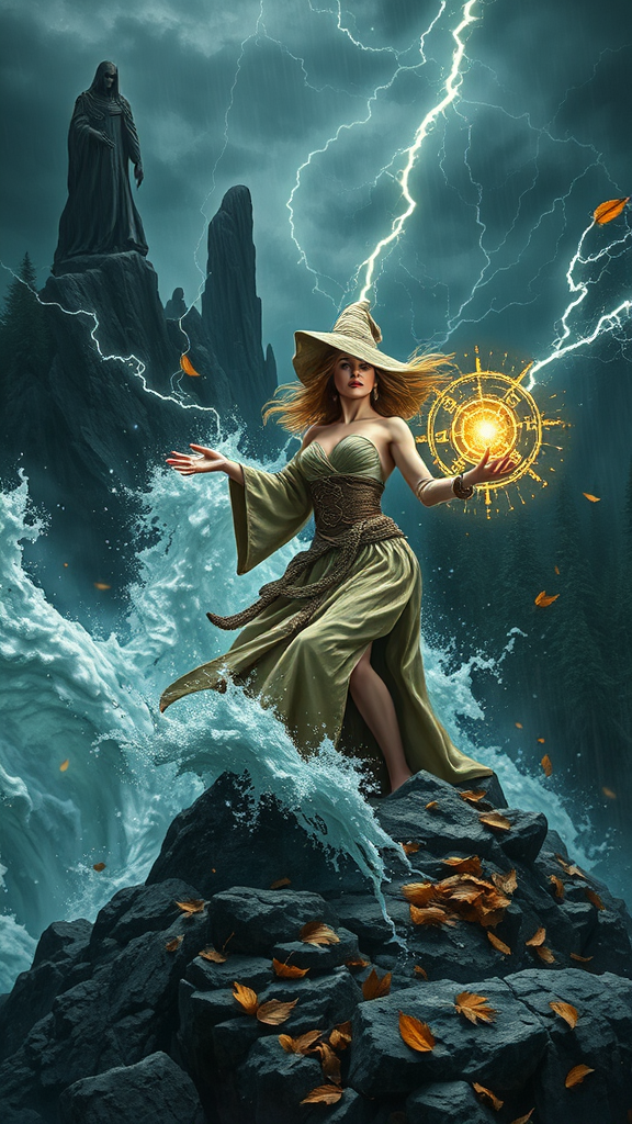 Art inspired by Robert Maguire, masterpiece, exquisite quality, captivating pinup model with luminous skin, gentle lighting, adorned in a wizard robe on a blustery mountain peak, amidst a tempestuous storm. The scene is sharply focused, showcasing a fantasy wizard casting a spell. Enveloping her is swirling water, crackling with electricity and sparks, as columns of rock rise from the earth. The strong wind whips around her, scattering leaves, while a glowing magical circle and potent runes illuminate her surroundings. Shadowy figures loom in the background of a dark forest, adding a sense of mystery and intrigue.