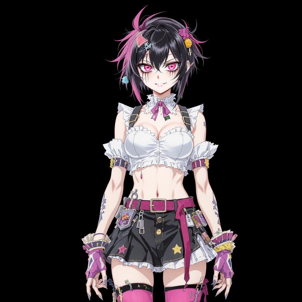 Art reminiscent of Shintaro Kago, featuring a solo character with a menhera aesthetic and Yamikawa Punk influence. The figure wears a white blouse with frills, a skirt adorned with various accessories, and embodies the essence of Japanese subculture fashion, blending grunge with noise pop elements. The character has pink eyes and sports a manic, punky style, complete with colorful stockings that emphasize a pink theme. Intricate details adorn the face, with unique features such as cross-eyed expressions and artistic nods to surrealism like extra fingers and mutated hands, creating an avant-garde visual. The image captures a vibrant, bold atmosphere in 16k UHD HDR quality, steering clear of any cropping issues and ensuring clarity without text, signatures, or watermarks. The portrayal is dynamic, avoiding elements such as out-of-frame distractions or unnecessary additions, while maintaining an artistic edge and creativity within the core visual concept.