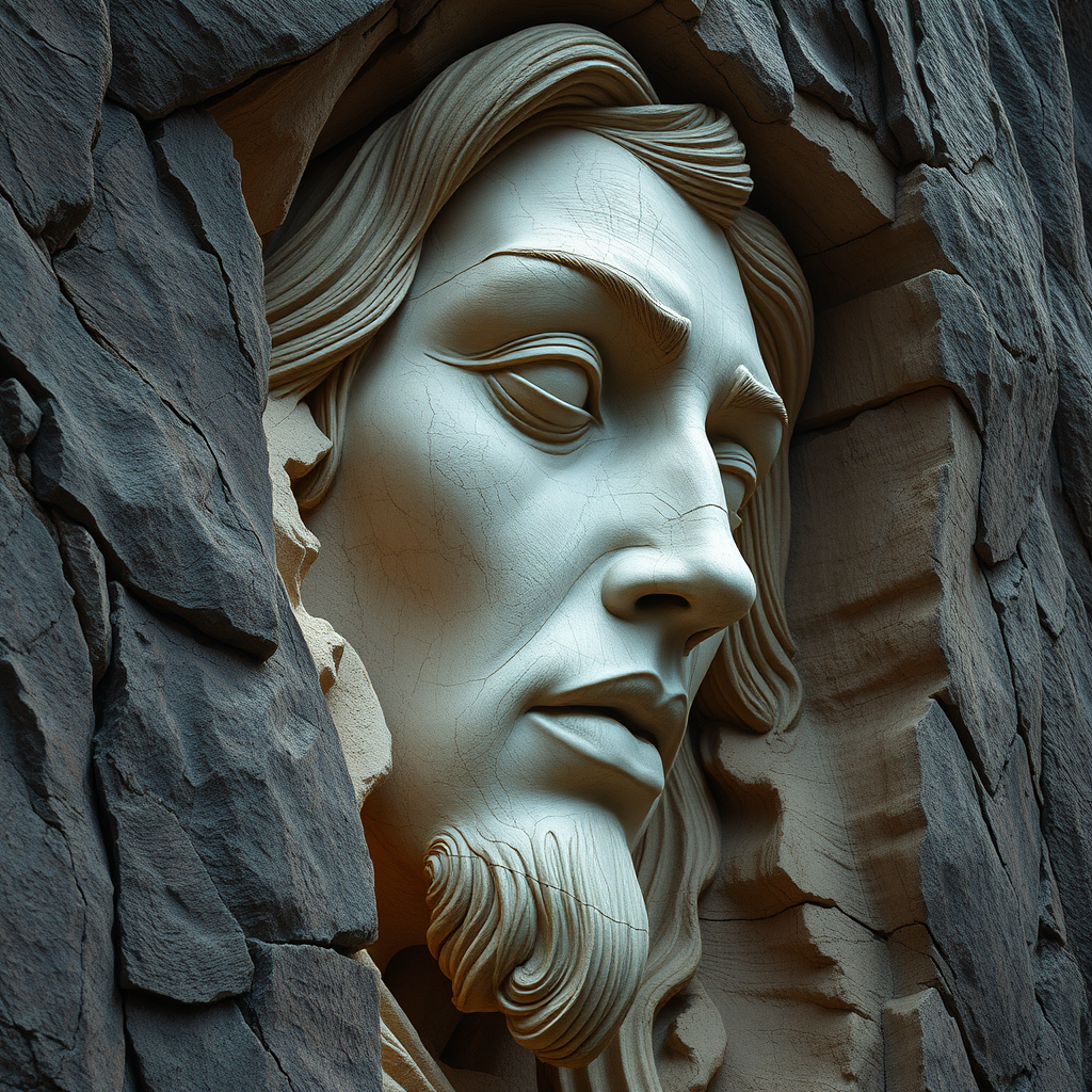 Art sculpture carved into cliffside, embodying realistic hyper-detailed portraiture, showcasing intricate facial features, drawing inspiration from the artistry of Ingrid Baars and Guido van Helten, with an emphasis on multi-panel compositions and concept art elements, capturing an atmospheric and immersive narrative, utilizing a vertical aspect ratio of 31:64 with an elevated stylization element.