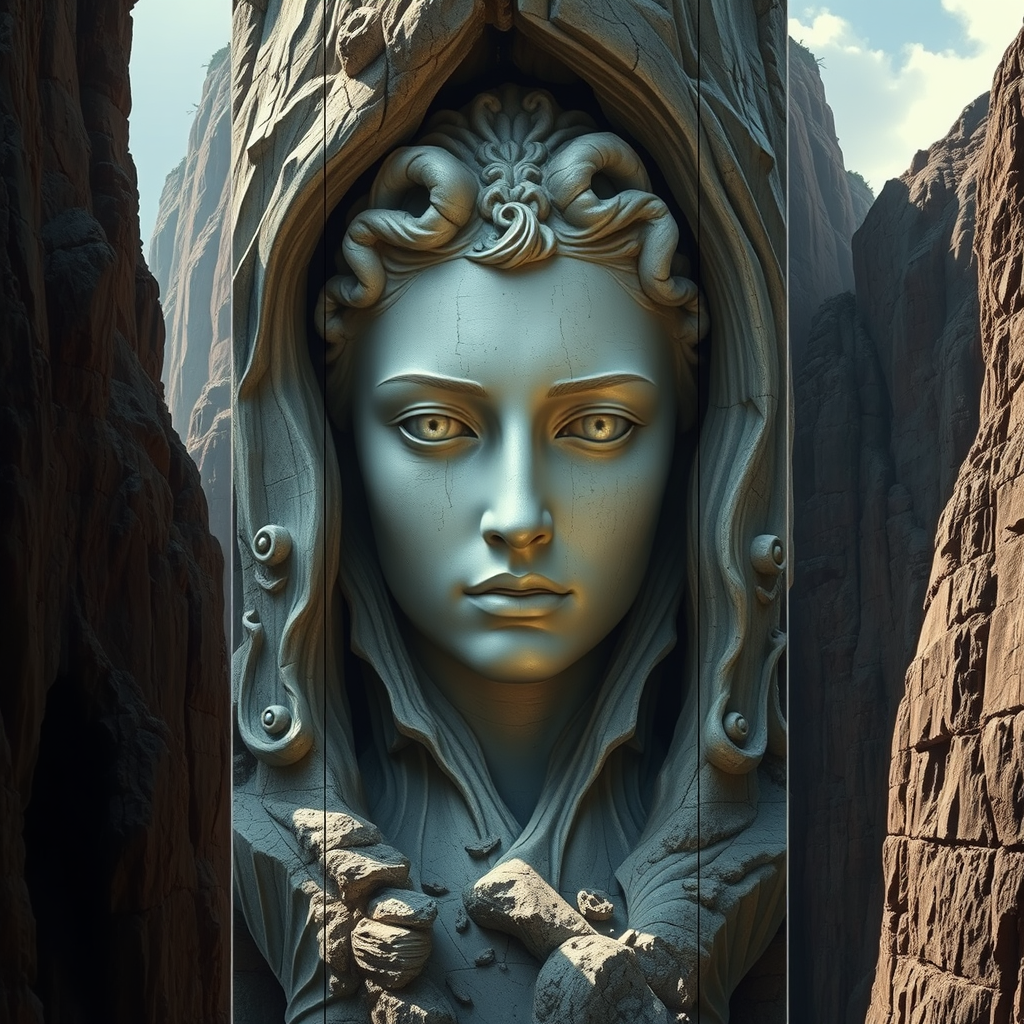 Art statue embedded within majestic cliffs, capturing the essence of realistic hyper-detailed portraits, rendered with a level of intricacy akin to CryEngine graphics, showcasing finely detailed facial features reminiscent of Ingrid Baars' work. The composition extends across multiple panels, inspired by the style of Guido van Helten, blending concept art elements to create a breathtaking scene. The aspect ratio is elongated, enhancing the dramatic verticality of the cliffs, with a touch of stylization that breathes life into the serene yet powerful visage, evoking a sense of ancient mystery and grandeur.
