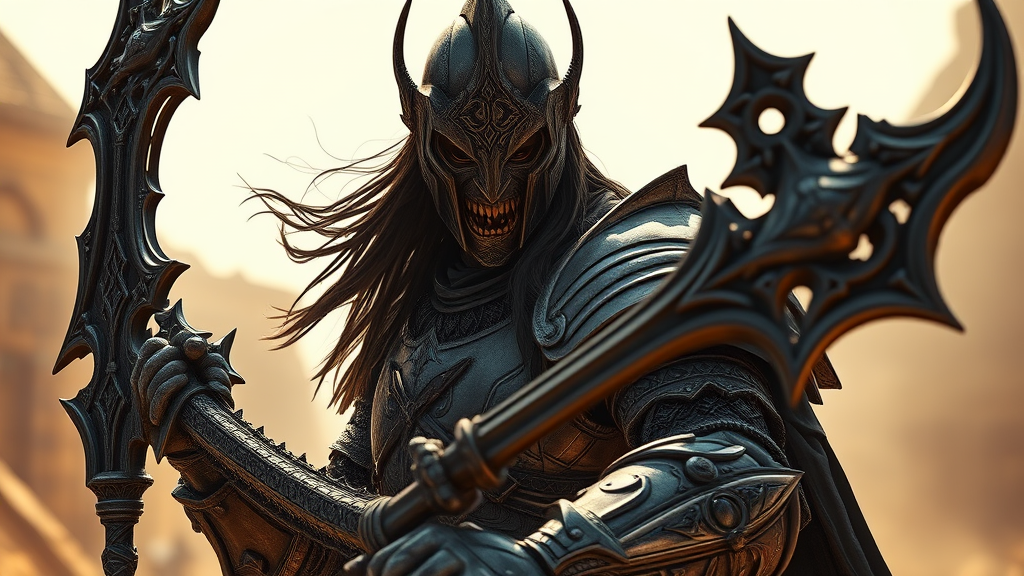 Arthas-inspired character from WarCraft reimagined as a Pathfinder vampire knight, wielding a formidable war scythe, clad in intricately carved full-plate armor. His helmet, devoid of a visor, reveals flowing long hair and menacing visible fangs. The scene is set in sun-drenched Egypt, blending epic and dark fantasy elements. The character design showcases intricate details, captured in a hyper-realistic, cinematic style with dramatic lighting, creating a photorealistic portrait of a fearsome warrior poised to strike.