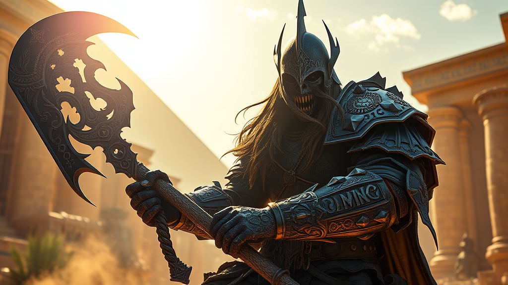 Arthas-inspired character from WarCraft reimagined as a Pathfinder vampire knight, wielding a menacing war scythe, clad in intricately carved full-plate armor with a helmet that lacks a visor, revealing cascading long hair. His fangs are bared as he launches an attack amidst the sunlit backdrop of ancient Egypt. This scene embodies elements of both epic and dark fantasy, showcased through a character design rich in intricate detail. The atmosphere captures a blend of hyper-realistic fantasy and cinematic lighting, akin to a photographic moment. The setting and character evoke a sense of awe within the vibrant, historical landscape, framed in a 9:16 aspect ratio.